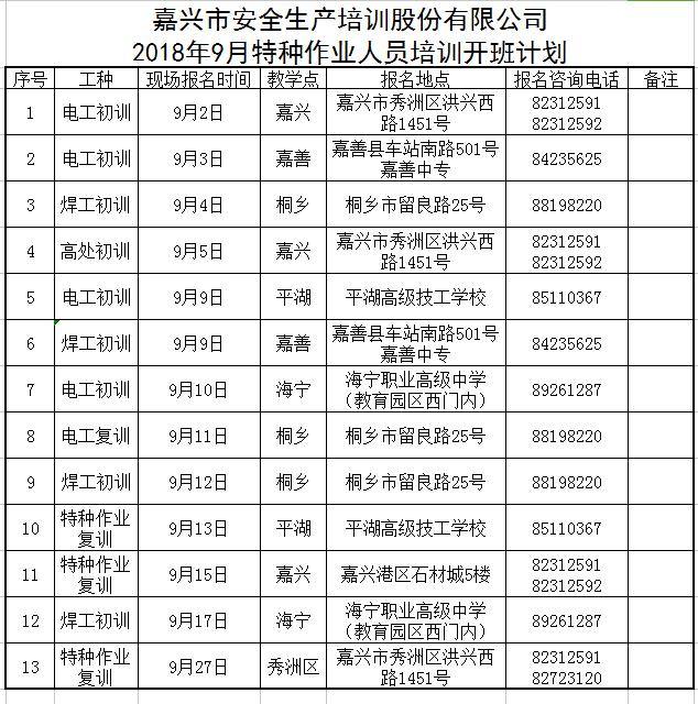 2018年9月特種作業(yè)人員培訓(xùn)開班計劃