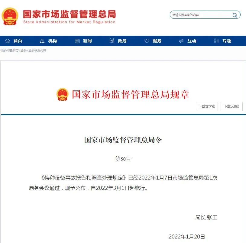 近日,國家市場監(jiān)督管理總局發(fā)布《特種設(shè)備事故報告和調(diào)查處理規(guī)定》,3月1日起施行。