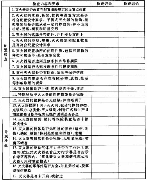 1、滅火器的日常檢查與維護(hù) 檢查的依據(jù)是《建筑滅火器配置驗收及檢查規(guī)范》 GB50444-2008 1)滅火器的檢查與維護(hù)應(yīng)由相關(guān)技術(shù)人員承擔(dān)。 2)每次送修的滅火器數(shù)量不得超過計算單元配置滅火器總數(shù)量的1/4。超出時,應(yīng)選擇相同類型和操作方法的滅火器替代,替代滅火器的滅火級別不應(yīng)小于原配置滅火器的滅火級別。 3)檢查或維修后的滅火器均應(yīng)按原設(shè)置點位置擺放。 4)需維修、報廢的滅火器應(yīng)由滅火器生產(chǎn)企業(yè)或?qū)I(yè)維修單位進(jìn)行。 5)滅火器的配置、外觀等應(yīng)按附錄C的要求每月進(jìn)行一次檢查。 6)下列場所配置的滅火器,應(yīng)按附錄C的要求每半月進(jìn)行一次檢查。 ①候車(機(jī)、船)室、歌舞娛樂放映游藝等人員密集的公共場所; ②堆場、罐區(qū)、石油化工裝置區(qū)、加油站、鍋爐房、地下室等場所。 7)日常巡檢發(fā)現(xiàn)滅火器被挪動,缺少零部件,或滅火器配置場所的使用性質(zhì)發(fā)生變化等情況時,應(yīng)及時處置。 8)滅火器的檢查記錄應(yīng)予保留。