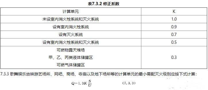 計算公式: 單元最小滅火級別Q(A或B)=K(修正系數(shù),查表)×設(shè)置滅火器場所的單元面積(㎡)÷火災(zāi)類別的滅火級別最大保護(hù)面積(查表,㎡/A或㎡/B)