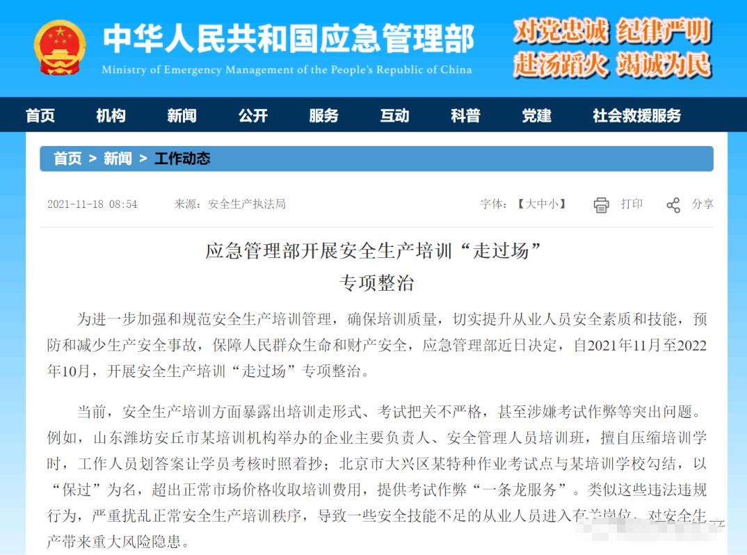 為進一步加強和規(guī)范安全生產(chǎn)培訓(xùn)管理,確保培訓(xùn)質(zhì)量,切實提升從業(yè)人員安全素質(zhì)和技能,預(yù)防和減少生產(chǎn)安全事故,保障人民群眾生命和財產(chǎn)安全,應(yīng)急管理部近日決定,自2021年11月至2022年10月,開展安全生產(chǎn)培訓(xùn)“走過場”專項整治。