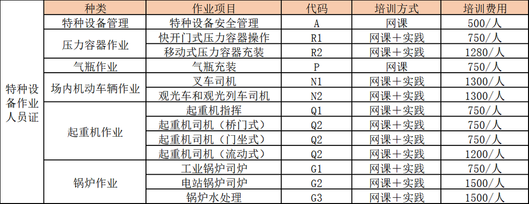 二、報(bào)名注意事項(xiàng) 1.報(bào)名材料:身份證復(fù)印件一份,二寸白底照片2張,身體健康證明(體檢報(bào)告)一份(報(bào)考叉車、觀光車、鍋爐水處理需要提供),申請表一份(單位蓋章)。 2.報(bào)名條件:18—60周歲身體健康。 3.證書期限:每四年內(nèi)復(fù)審一次。